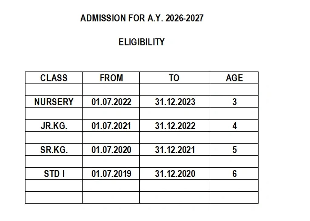 CHILDREN BORN BETWEEN O1.07.2022 TO 31.12.2023 WILL BE ELIGIBLE FOR NURSERY CLASS.
